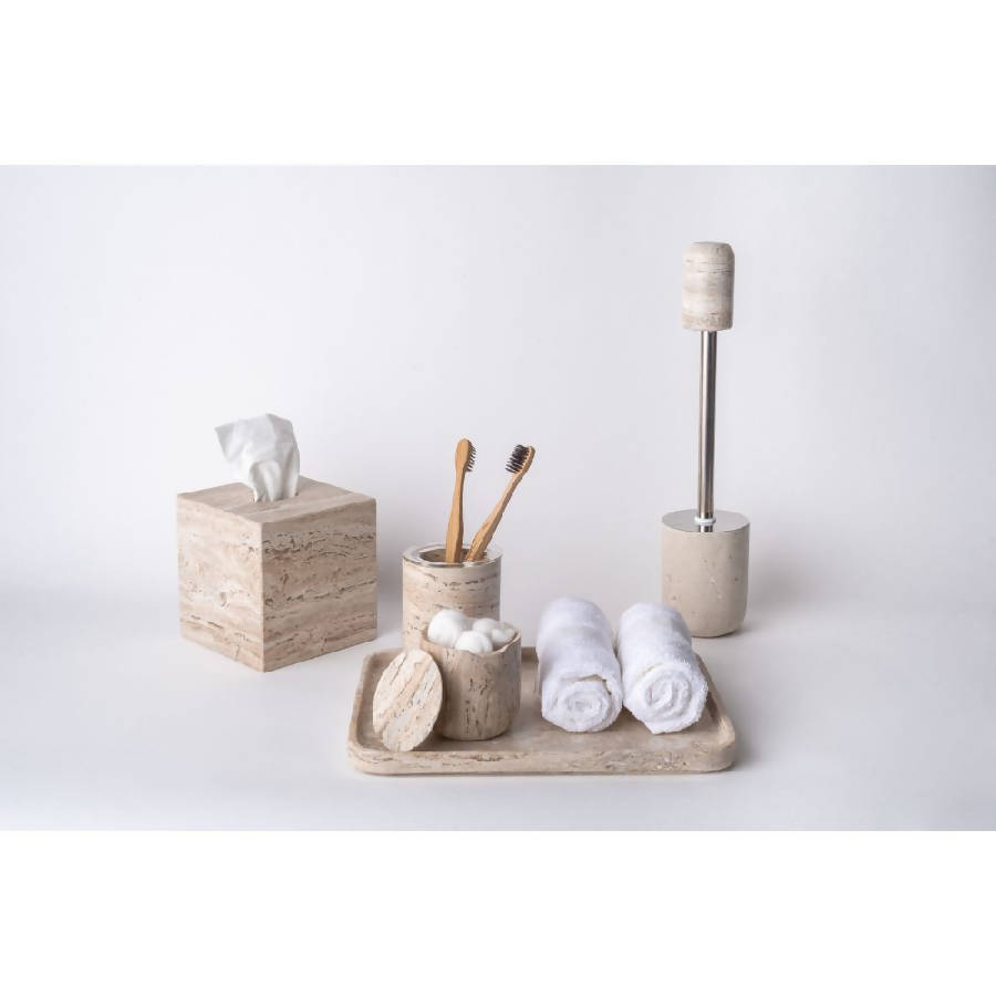 The low Travertine Container is ideal for storing your makeup remover pads, bath salts, cotton, and more. It's a perfect accessory and it will add a beautiful touch to your bathroom, dressing table, or anyplace that you want to put it. The travertine marble is beautiful, elegant, cozy, and fits with any environment.
